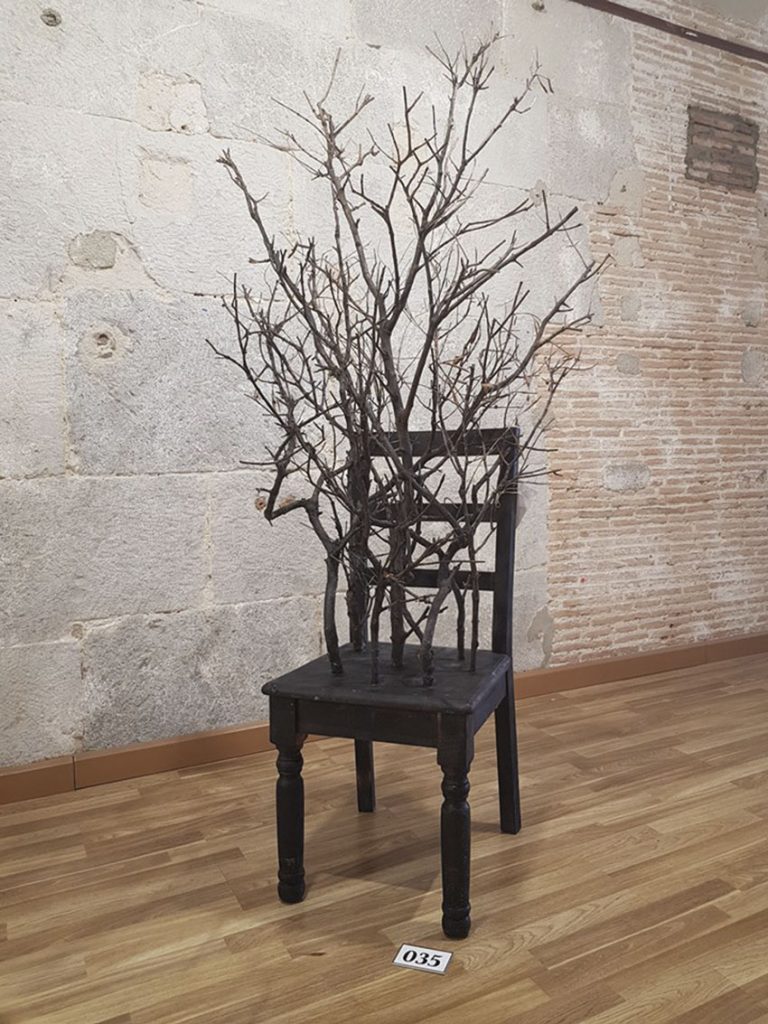 The Third Prize, the Leni Mifsud Award, was presented to Derek Duarte for his sculpture ‘Naturaleza Muerta’.  An old wooden chair with twigs attached, sits in one of the vaults, a simple structure, says the adjudicator, but one that has great presence. A practical object that has its history but one that’s lost its use, with the twigs that sprout from its base also dead. “An elegant and beautiful thing”