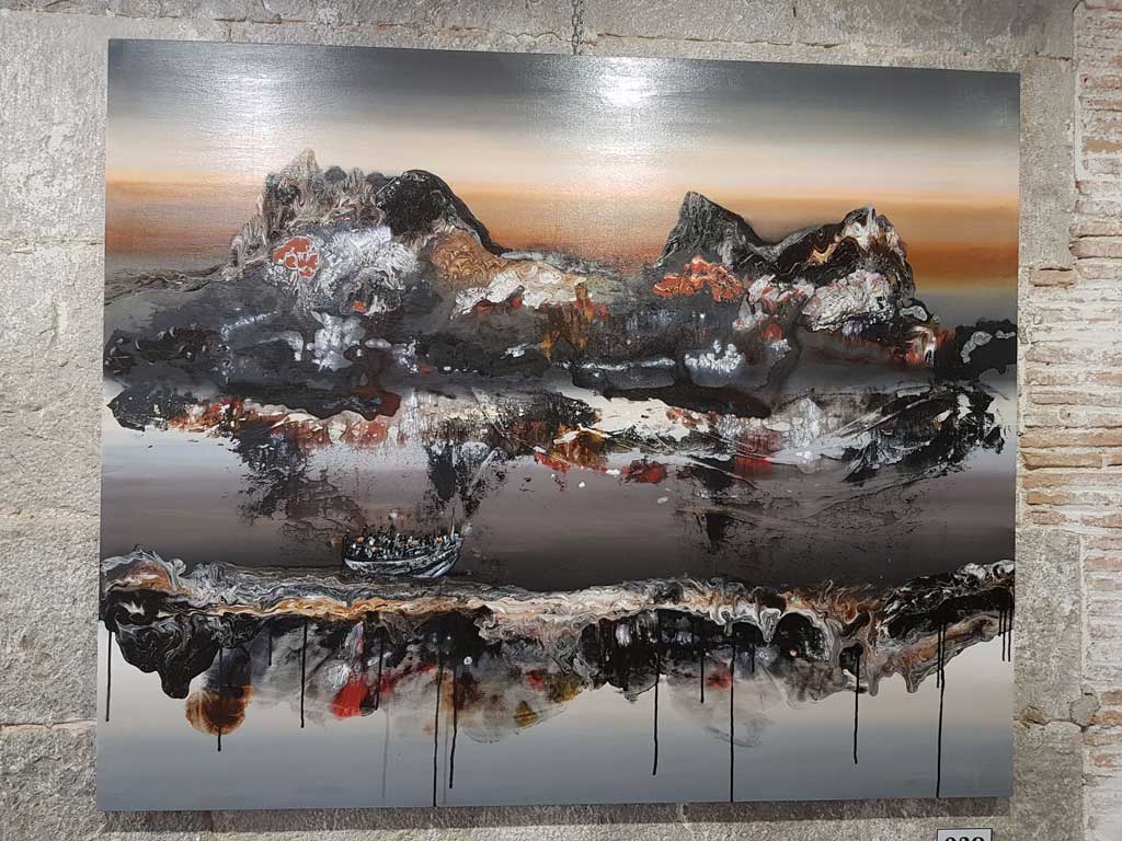 The Jacobo Azagury Prize, ‘A Voyage into The Unknown’, depicts the Rock of Gibraltar but is a painting about a passage at sea. Brian Catlin says the work by Gabriela Fernandez Lopez focuses on a moment of calm held between a great storm, with a boat perhaps a refugee boat, sailing through. He believes it captures the essence of being at sea where land can became an illusion. But the artist’s application and technique is something he praises, saying these are used effectively to create turmoil and movement. A powerful piece, carefully handled.