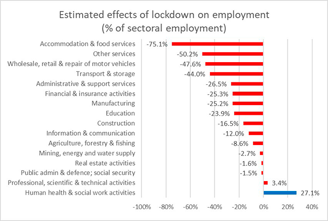 Their findings suggest that the most affected sector in terms of effects which the lockdown will have on employment will be ‘Accommodation & Food Services’ (-75%), followed by ‘Services and Retail’ (which is predicted to be almost halved at 47.6%), and ‘Transport’ (-44%).
